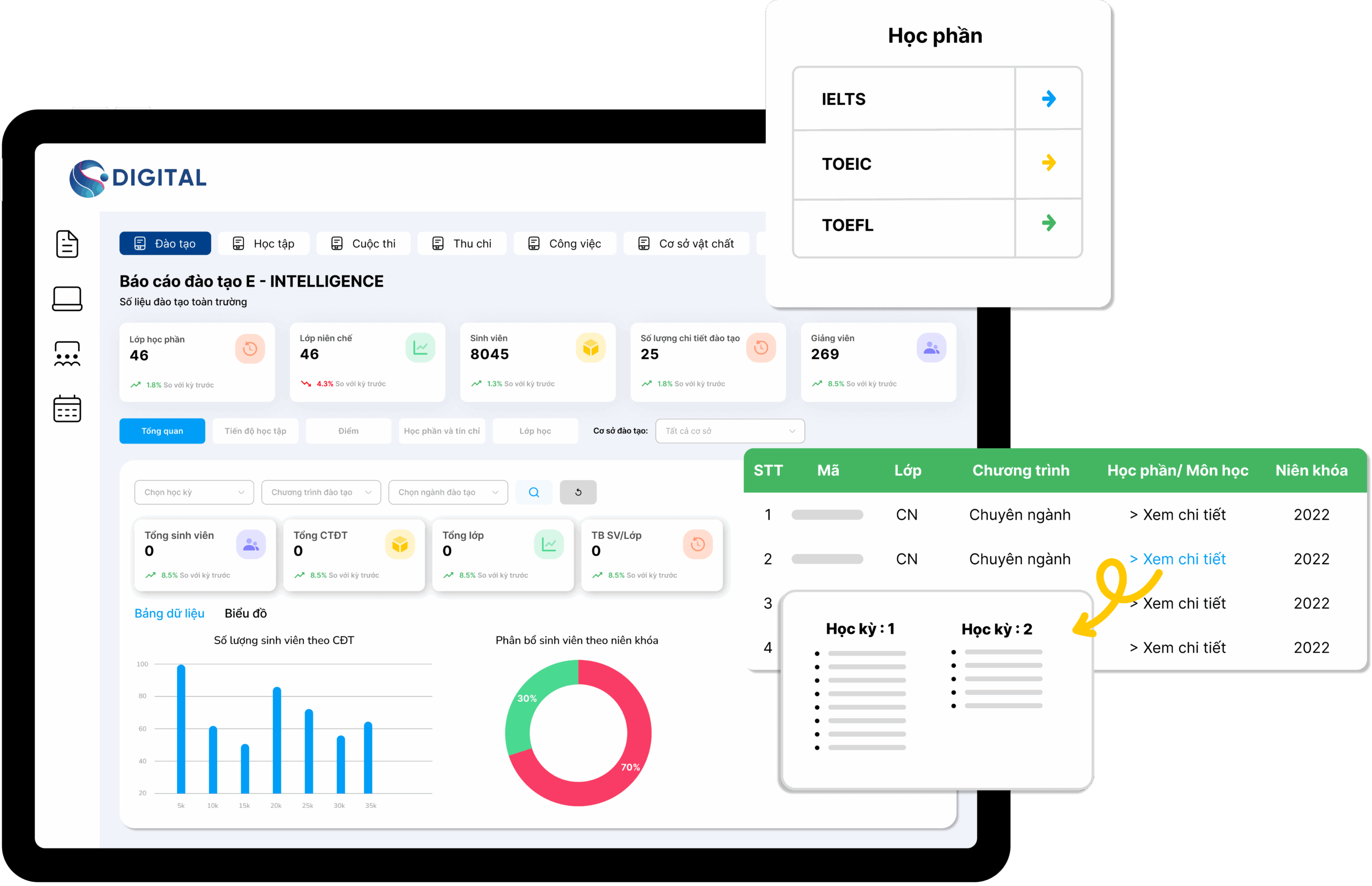 Bộ tính năng quản lý toàn diện hoạt động đào tạo từ cơ sở dữ liệu, kế hoạch, tiến độ tới kết quả